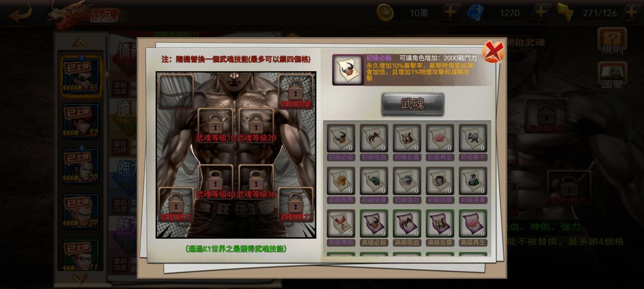 武魂技能是角色除開本身自帶技能外可裝備的附加技能,武魂技能能力各異,玩家可以根據自身需要進行選擇。在武魂技能欄裝備武魂技能可以提升戰力,並在戰鬥中發揮不可或缺的作用。武魂技能分為初級、中級和高級,武魂技能均可通過王者商店以及K1世界之最獲得。值得注意的是,部分增加屬性的武魂技能在跟班系統中也能發揮作用。
