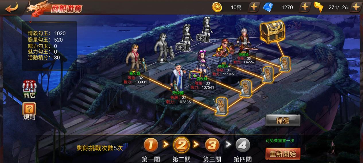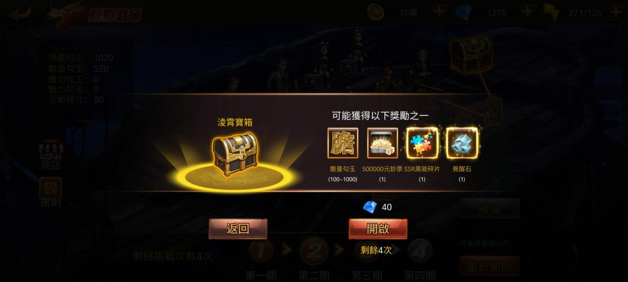 值得注意的是,完成的關卡等級越高,每次挑戰獲勝的獎勵以及通關後商船寶藏的獎勵也就越多。每個商船寶藏都有一次免費開啟的機會和5次鑽石開啟的機會,免費開啟機會未用完的情況下,無法進行下一大關。